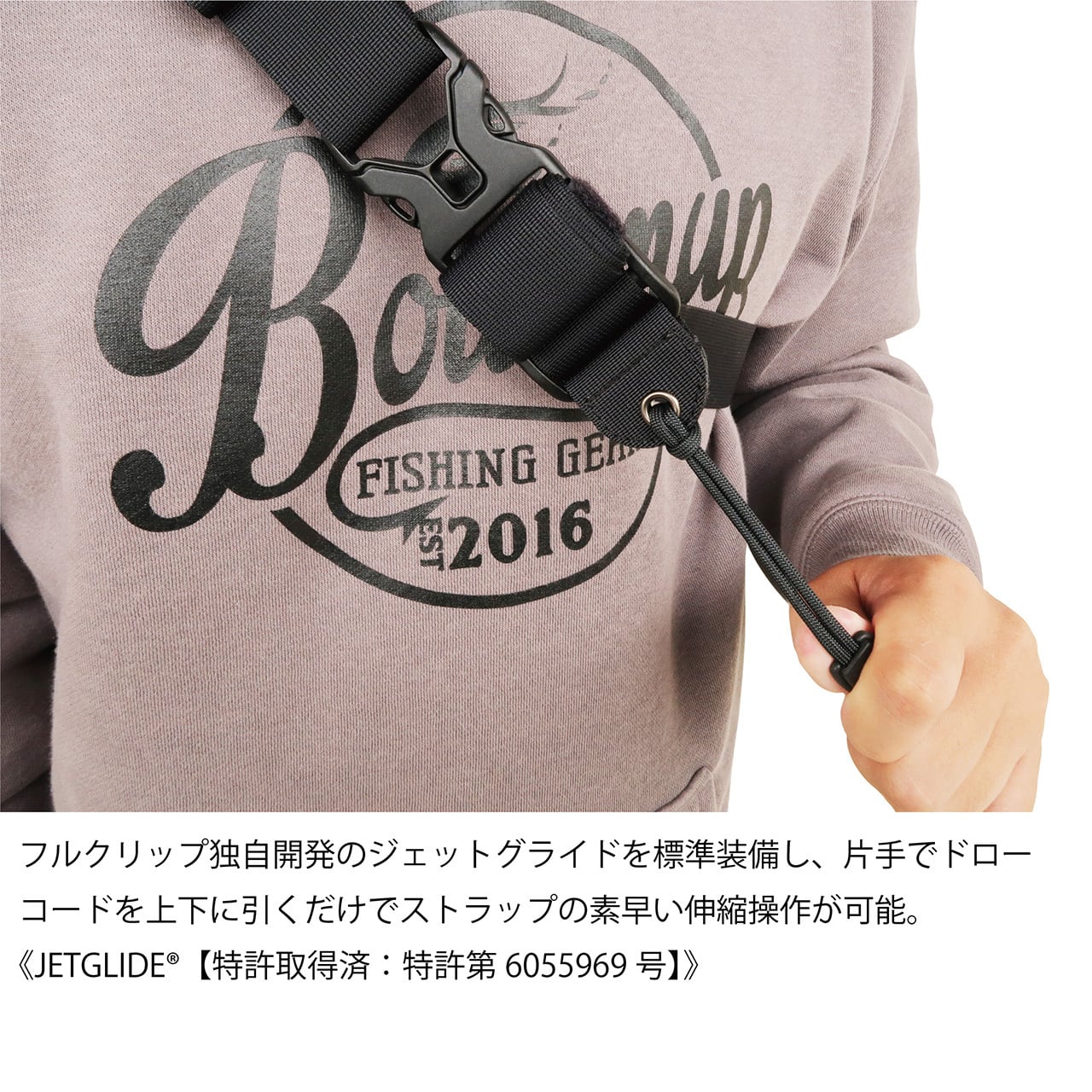 また、フルクリップ独自開発のジェットグライドを標準装備し、片手でドローコードを上下に引くだけでストラップの素早い伸縮操作が可能。