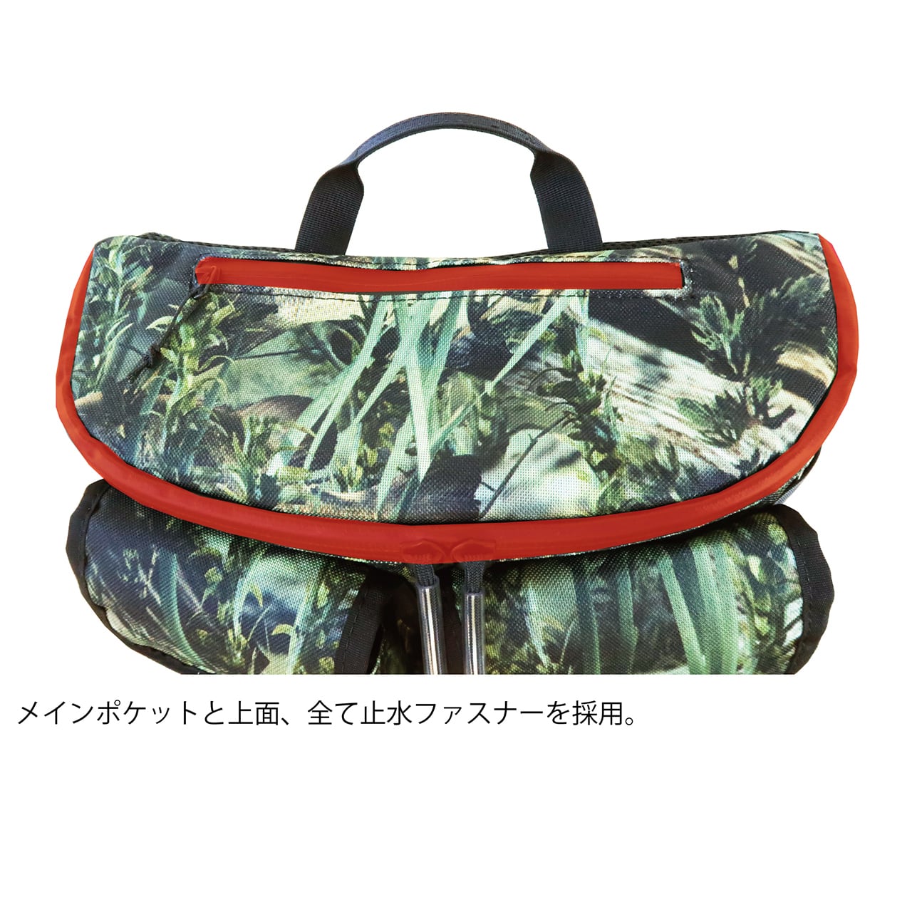 ファスナーは全て止水仕様、身体に当たる本体背面には、通過性に優れ弾力のある立体メッシュ、底面は建築で使用される丈夫な防水素材を使用。