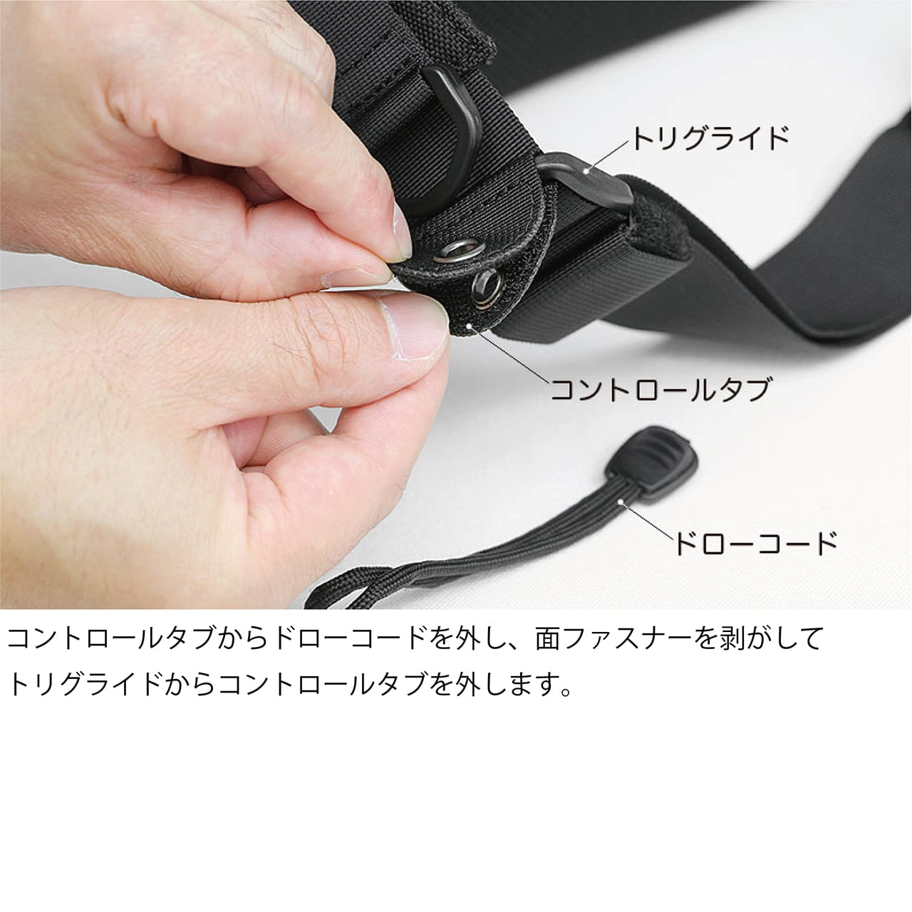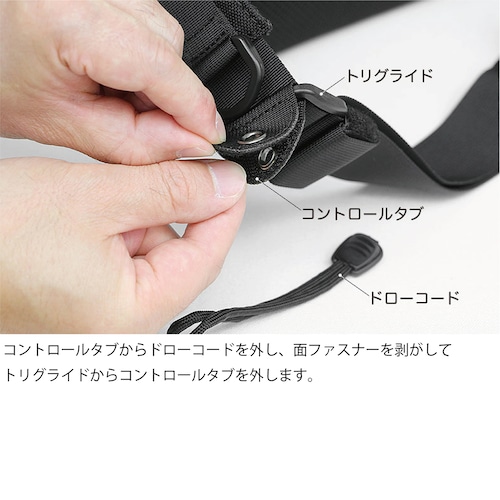 また、フルクリップ独自開発のジェットグライドを標準装備し、片手でドローコードを上下に引くだけでストラップの素早い伸縮操作が可能。