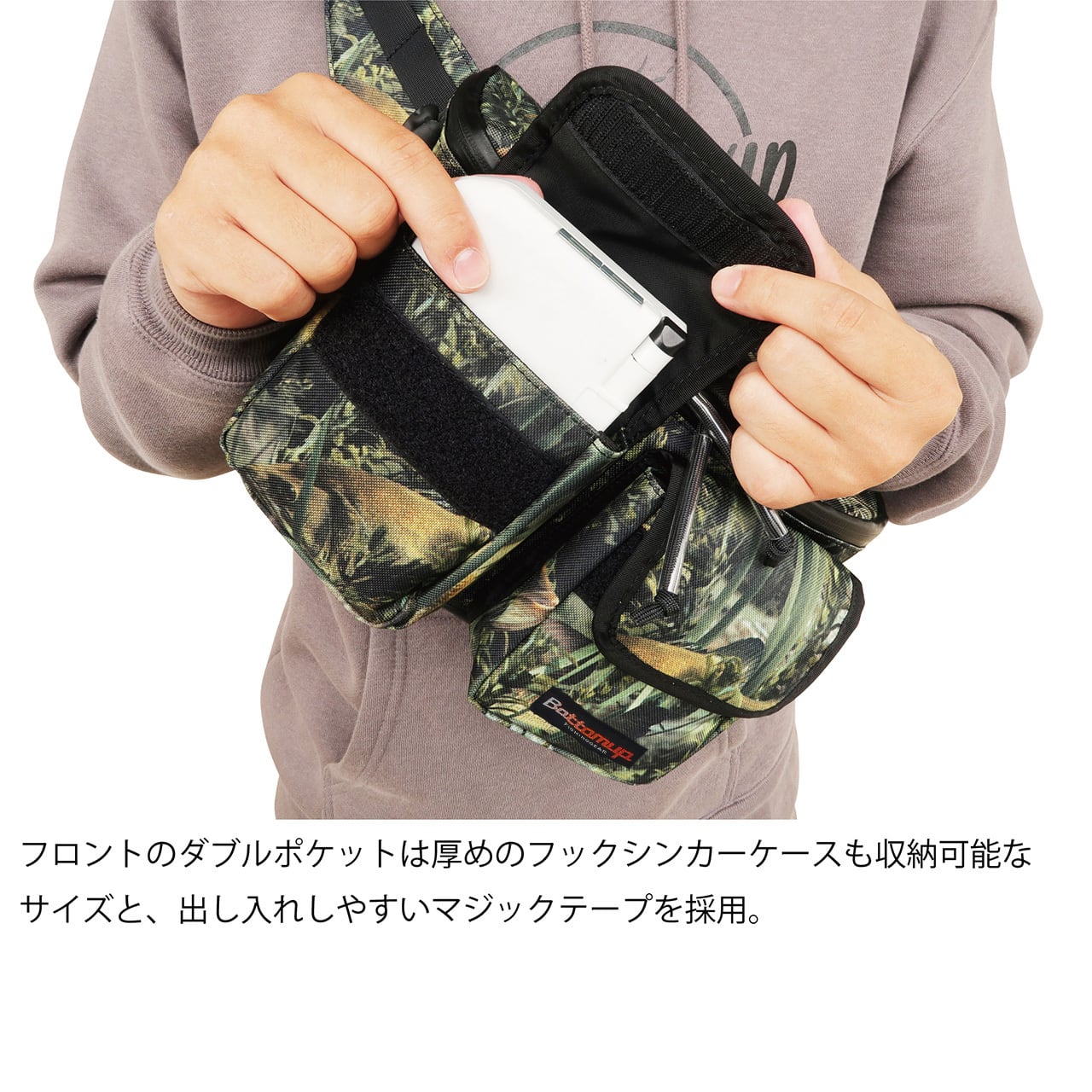 フロントのダブルポケットは厚めのフックシンカーケースも収納可能なサイズと、出し入れしやすいマジックテープを採用。